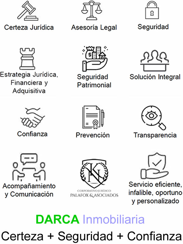 Por lo que cada inmueble que se promociona y cada operación que se realiza en Darca Inmobiliaria cuenta con certeza jurídica, seguridad y la confianza de una investigación plena e integra por parte de Corporativo Jurídico Palafox & Asociados, por lo que su operación y patrimonio es absolutamente seguro.